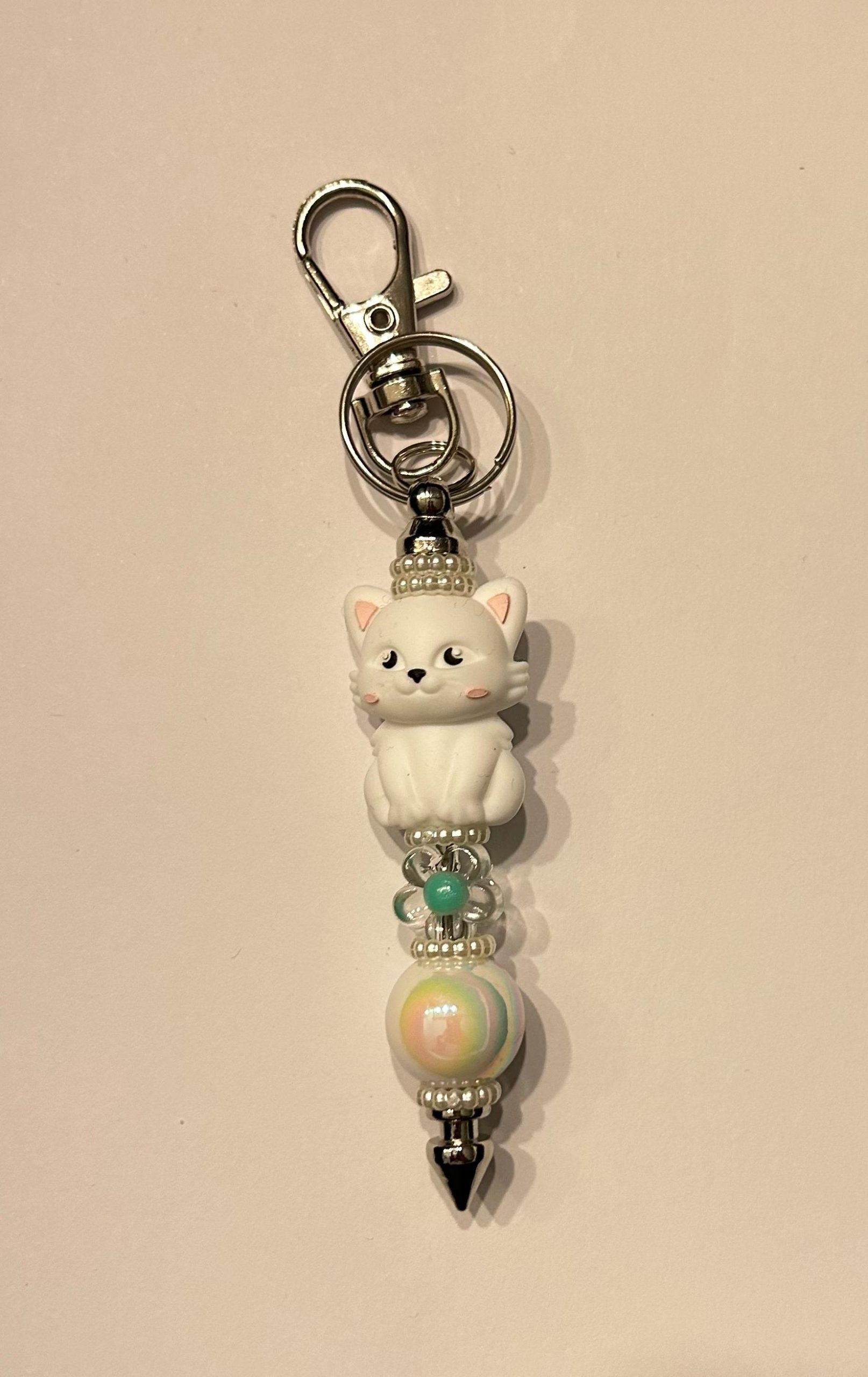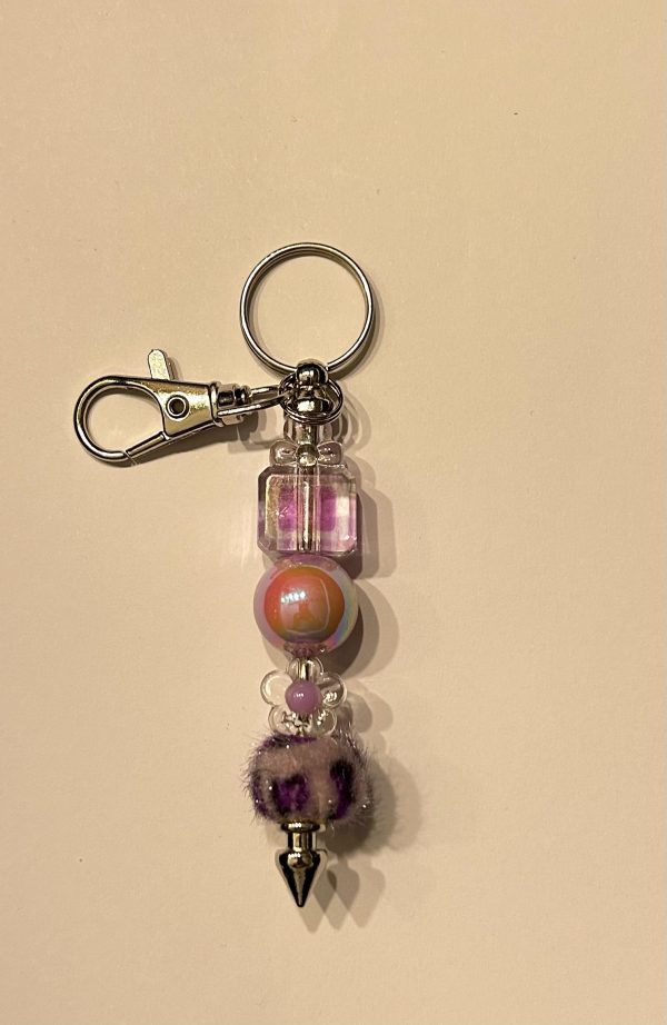 Een charmante sleutelhanger in zachte lila tinten, met glanzende kralen, een doorzichtige bloem en een fluffy accent. Ideaal voor een subtiele touch van kleur en zachtheid aan je tas of sleutelbos!