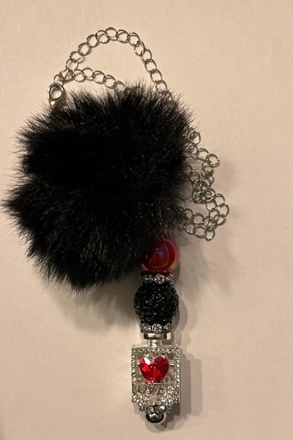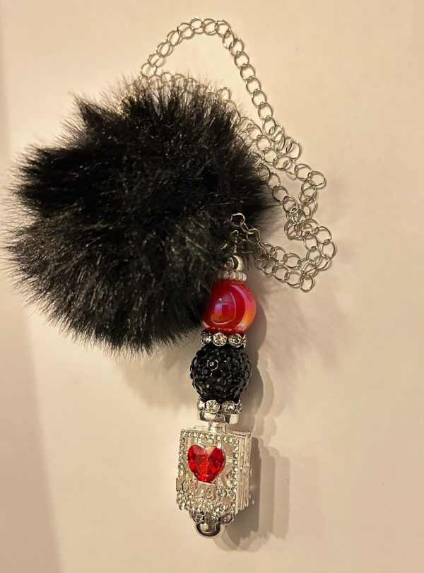 Deze handgemaakte autocharm is een echte eyecatcher voor aan je binnenspiegel. Met een fluffy zwarte pompom, fonkelende kralen en een parfumflesje met rood hart en het woord “LOVE” straalt deze hanger pure romantiek uit – ideaal voor de glam girl on the go!