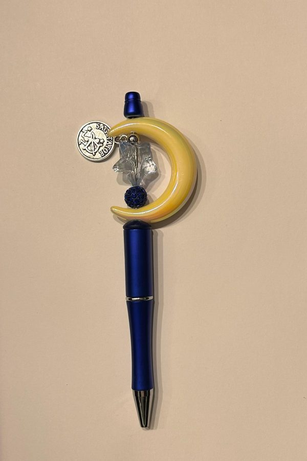 Deze diepblauwe pen is een magisch stukje hemel met een grote gele maansikkel, een kristallen ster en een Boogschutter-bedeltje. De donkerblauwe kraal met glinstering maakt het geheel af. Een perfect cadeau voor sterrenliefhebbers!