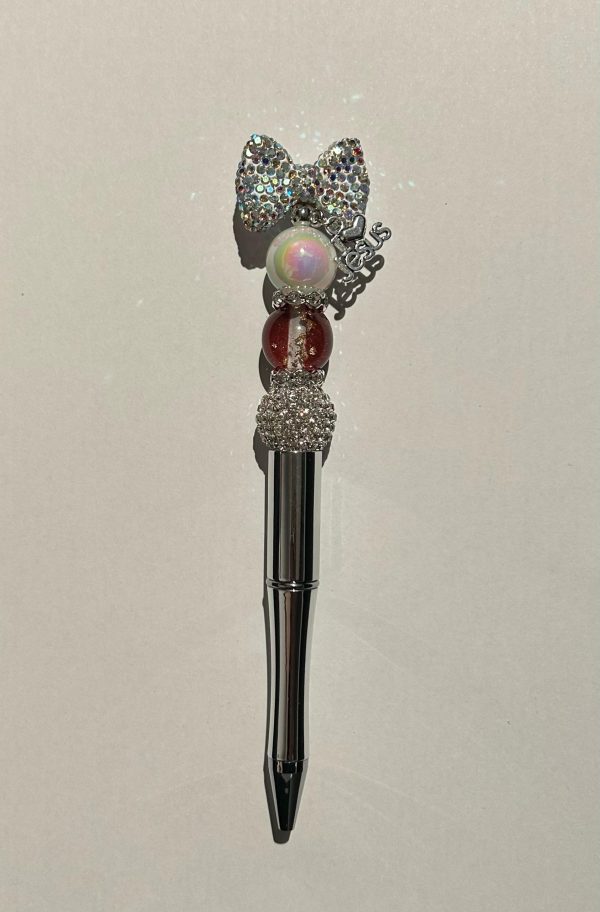Deze sierlijke pen met glanzend zilveren body is versierd met glinsterende kralen, een fonkelende strik en een charm met de tekst I ❤️ Jesus. Een stijlvolle reminder van geloof en liefde — perfect om met inspiratie te schrijven!
