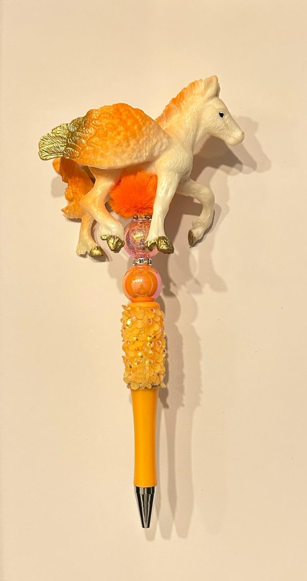 Deze sprookjesachtige pen met een gevleugeld paard, oranje details en fonkelende kralen brengt magie naar je schrijfervaring. Een vrolijk, dromerig ontwerp dat kinderen én fantasylovers doet stralen.