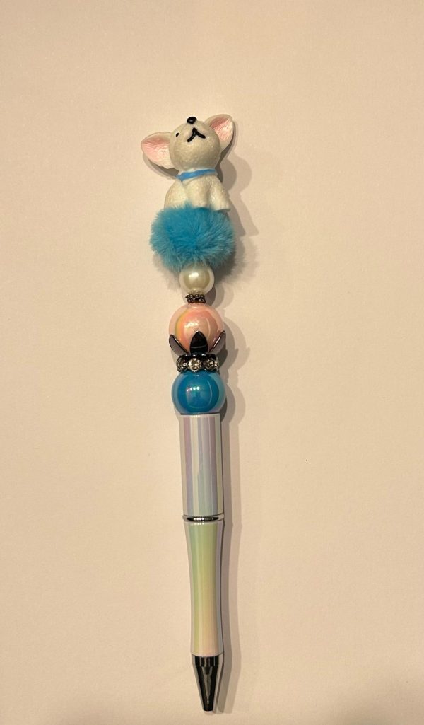 Handgemaakte kralenpen – Rainbow Pup Deze vrolijke pen met een schattig hondje, blauwe pompon en parelmoer regenboogschacht is perfect voor dierenvrienden met een kleurrijke stijl. Een lieve en speelse touch voor op je bureau!